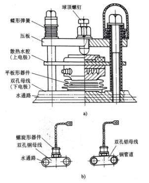 (5)除了原理上分析的各種不均流因索和相應(yīng)采取的均流措施外,元件裝配的質(zhì)量優(yōu)劣對電流平衡影響很大,必須給予充分重視。快恢復(fù)二極管的陰極、陽極和散熱導(dǎo)體的貼合應(yīng)緊密,保持一定的壓力,防止產(chǎn)生不平衡電壓。在電源裝置從裝配地運(yùn)往現(xiàn)場安裝后,還須作一次全面檢查,并復(fù)試每臂均流情況。圖2是采用雙孔內(nèi)水冷母線(兼作散熱器)的螺旋形快恢復(fù)二極管和平板形快恢復(fù)二極管的裝配圖。對于螺旋形快恢復(fù)二極管應(yīng)保證元件螺栓中心與散熱母線螺孔中心良好的重合性以及接觸面的平整。對于平板形快恢復(fù)二極管,除要求接觸面平整外,還應(yīng)對壓緊的球頭螺栓施以一定的扭力矩(圖示快恢復(fù)二極管所施加扭力矩為(50N·m±5N·m),以保證快恢復(fù)二極管管芯和散熱器之間,有一定的接觸壓力。